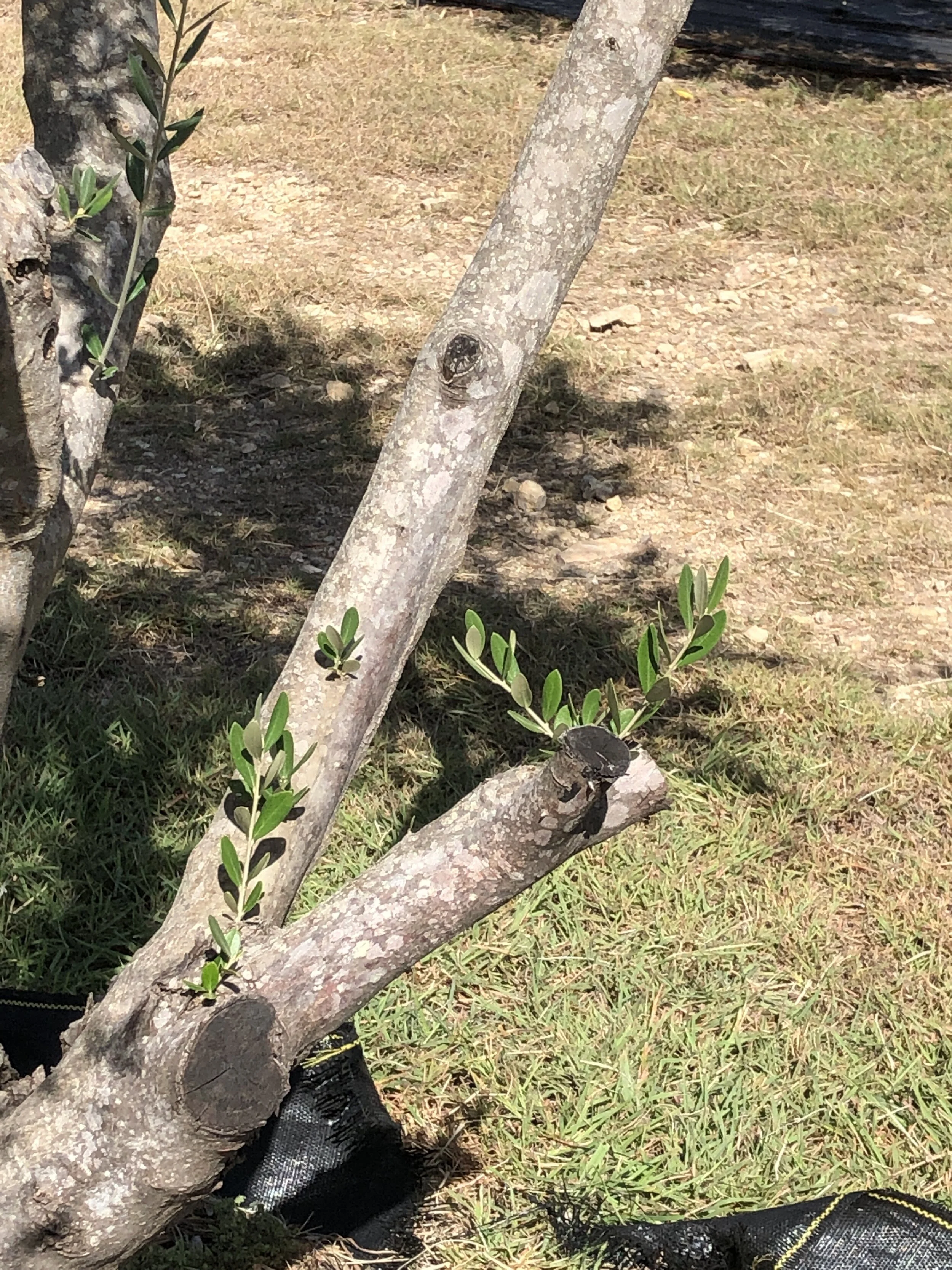 What a smart plant. One branch laden with olives has another branch growing on top of it with no fruit. The top branch is new growth and won’t have fruit until next year.